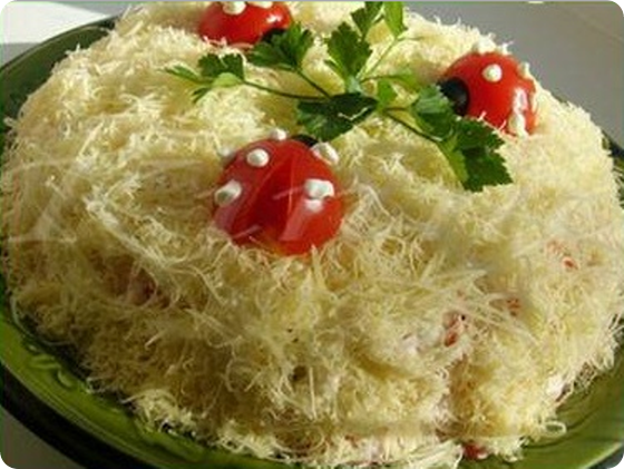 5.Тёртый сыр. Залить майонезом и густо посыпать рубленным укропом, украсить цветочками вырезанными из яйца. Приятного аппетита!