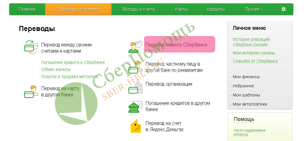 В разделе Платежи и переводы выбираем пункт “Перевод клиенту Сбербанка”. Перевести деньги по номеру телефона можно только клиенту Сбербанка.