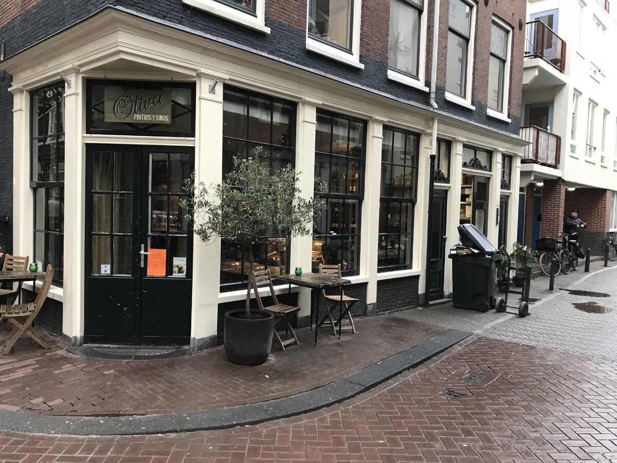 Если вы попадете в столицу Нидерландов, то вам обязательно надо посетить это место. Нам его посоветовали друзья, которые живут в Амстердаме. Основная концепция – это, так называемые, Тапасы – испанского типа блюда. Тапасы – это многослойные бутерброды и не обязательно на хлебе. Мы взяли разных тапасов, которые в меню называются Pintxo, овощной суп-пюре и сэндвич со стейком. Сэндвич, а точнее сам стейк оказался так себе – в Амстердаме я пока не встречал хороший стейков, мне кажется, мясо не их конек. Суп хорош – чувствуется хороший набор овощей, специй и остроты. К супу подается хлеб с безумно-вкусным оливковым маслом. Хлебе было больше, просто пока вспомнил про то, что надо сфотографировать, уже съели эту вкуснятину. А вот тапасы – это, я вам скажу, отвал башки. Король меню, тапас с грибами, беконом и блючизом (на фото верхний правый). Это самый вкусный тапас. Если попадете в это заведение, берите сразу два. Бекон им поставляют из Италии и он очень хорош. Прочие тапасы тоже приличны
