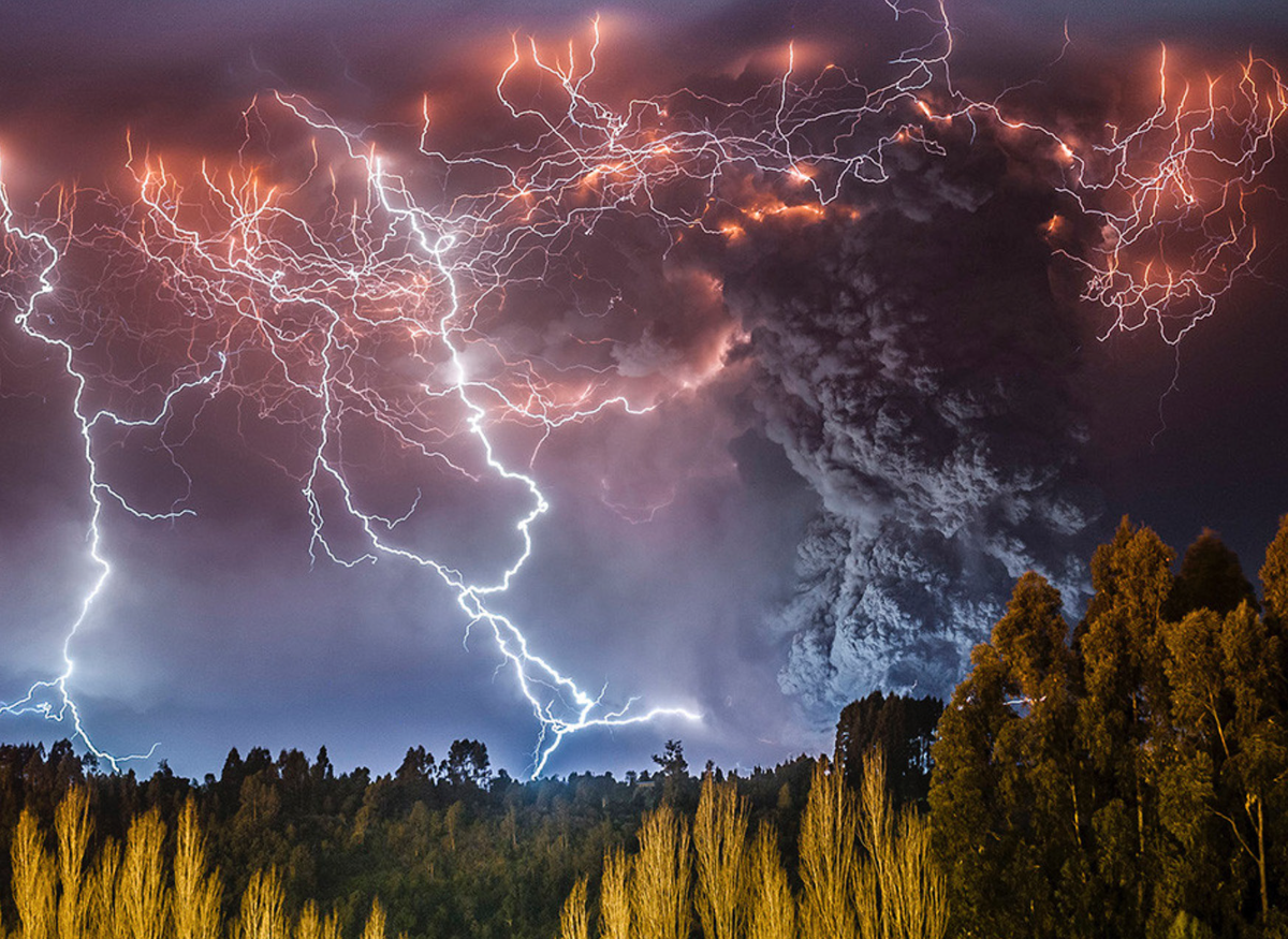 Извержения вулканов часто сопровождаются ударами молний – люди заметили это давно, однако систематически изучать стали только в самом конце ХХ века. Скорее всего, причиной этому служат пьезо- и трибоэлектрические явления в пластах неспокойной, движущейся породы – электричество возникает при деформации и трении. Когда в небо начинает подниматься дым, свой вклад вносит и трение между частицами вулканического пепла: при особенно высоких выбросах (более 7 км) молнии возникают чаще.