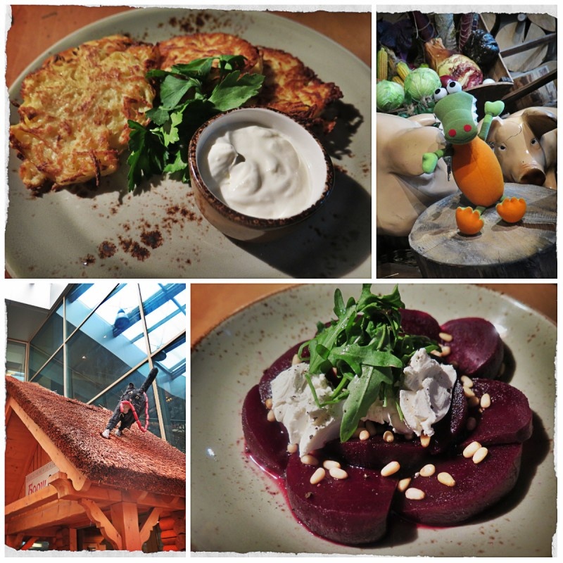 Мне понравился сумрак и светильник в виде соломенной шляпы) Занавески на окнах, как в настоящей украинской хате Аппетитные картинки на стенах Но вот уже несут чаек, у меня земляничный, а второй чайник был с дикой вишней. А в стаканах кисель, очень правильный, почти без сахара! Салат из домашнего сыра, вишни и вареной свекл