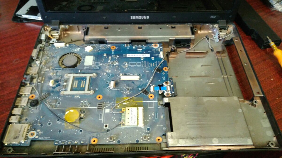 В наш сервис принесли ноутбук Samsung R519, который не включается, не заряжается. В данном случае и диагностировать не пришлось, сразу в глаза бросился сломанный разъем питания. Разбираем ноутбук, снимаем материнскую плату и вот теперь мы добрались до разъема питания. Снимаем сломанный разъем, подбираем подходящий, устанавливаем его в корпус, проверяем- ноутбук стартует! перед тем как собирать ноутбук обратно- чистим систему охлаждения: убираем превратившуюся в камень термопасту, валенок из пыли между радиатором и кулером, смазываем кулер, наносим новую термопасту MX-2. Полностью собираем, проверяем, отдаем клиенту. Ремонт ноутбука Samsung R519 выполнен!
