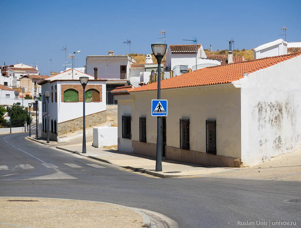 Тогда мы поняли, что нам не сюда. Погуглил и выяснил, что надо задавать пещеры Гуадикса (Guadix caves или Cuevas de Guadix). Еще тот район можно поискать по названию квартала - Баррио-Сантьяго (Barrio de Santiago). Дорога нас повела наверх по холму. Вот первые домики под землей: