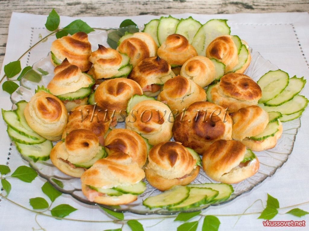 Рецепт приготовления заварных профитролей с нежной красной рыбой слабого посола. Профитроли с рыбой на праздничном столе – это эффектно, торжественно и аппетитно. Такое блюдо, в качестве закуски, можно готовить не только на семейные торжества, но и на корпоративные фуршеты оно будет вполне уместно. Готовятся профитроли с любой начинкой: красной рыбой, икрой, свежей зеленью, сливочным или творожным сыром и т.п. Эти же профитроли можно наполнять и сладкой начинкой: кремом, сгущенкой, взбитыми сливками и т.д. Необходимые ингредиенты: Для теста: - 120 – 150 г. сливочного масла; - 200 мл. воды; - 1/4 ч. ложки соли; - 3 – 4 яйца; - 160 г. пшеничной муки. Для начинки: - 200 г. красной рыбы (соленой, маринованной); - 200 г. свежего огурца; - 2 ст. ложки густой сметаны + 1 ч. ложка хрена. Как приготовить: http://vkussovet.net/1129-profitroli-s-krasnoy-ryboy.html