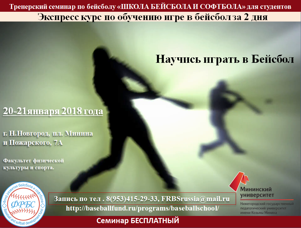 ВПЕРВЫЕ В НИЖНЕМ НОВГОРОДЕ!!! 20-21 января 2018 г. в стенах Факультета физической культуры и спорта НГПУ им. Козьмы Минина состоится тренерский семинар по бейсболу в г. Нижнем Новгороде. Экспресс курс по обучению игре в бейсбол за 2 дня организован Фондом развития бейсбола и софтбола, Нижегородским государственным педагогическим университетом имени Козьмы Минина, и Общественной организации «Федерации бейсбола и софтбола Нижегородской области. Цель проведения тренерского семинара – развитие бейсбола в субъектах Российской Федерации, обучение бейсболу начинающих специалистов (учителей физической культуры, студентов), повышение квалификации и знаний Российских тренеров. На тренерский семинар приглашаются: студенты, учителя физической культуры, молодые специалисты, тренеры. Тренерский - преподавательский состав: Низов А.А. – МСМК, тренер Высшей категории, автор примерной программы спортивной подготовки по виду Бейсбол. Бакалец Акоста Ю.А. - Мастер спорта России по бейсболу, тренер вт