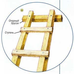Поперечины изготавливают из брусков, так как на них не только удобно стоять при работах на крыше, но и присесть. За такую ступеньку при необходимости можно и держаться. Широкая доска таких возможностей не дает.