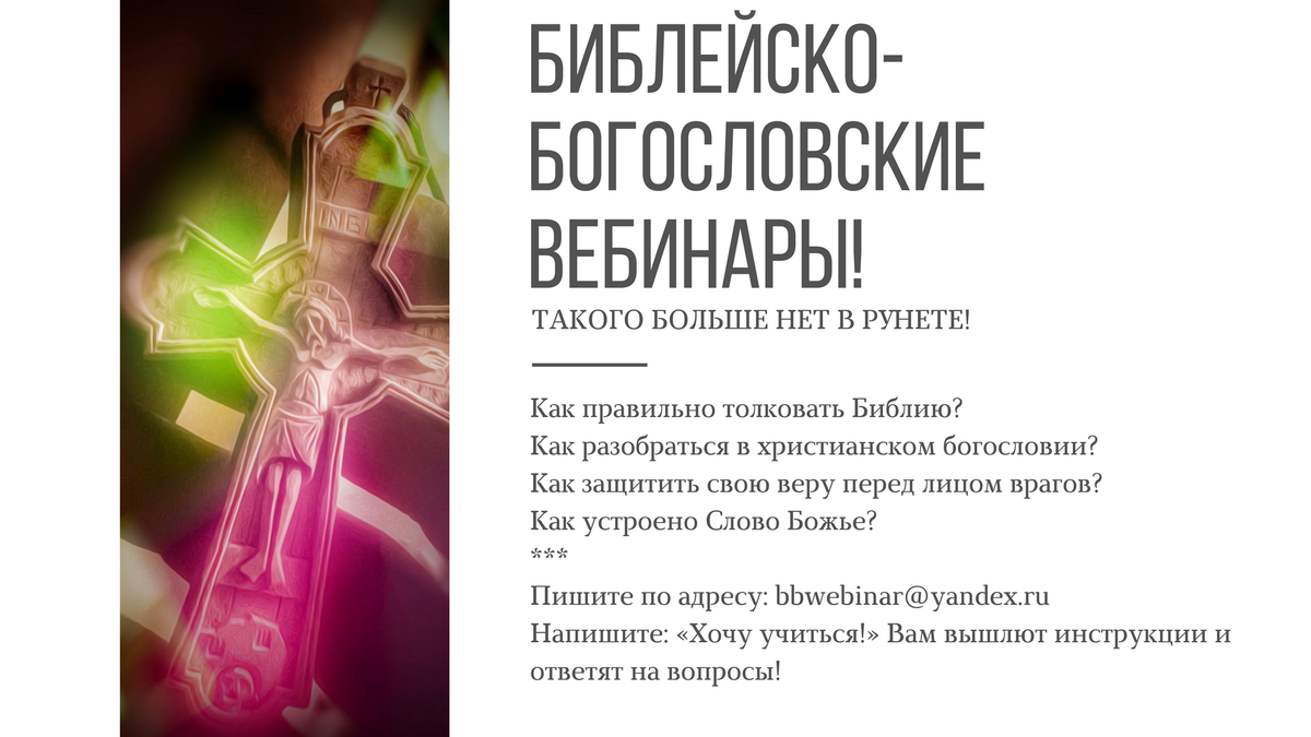 Дамы и господа! Я имею честь пригласить вас на уникальную учебную программу! Такого в рунете больше нигде нет! Библейско-Богословские вебинары! О Библии и о христианском богословии прямо у вас дома, не на уровне воскресной школы, но на уровне Семинарии! Торопитесь записаться! Начало занятий 15 января 2018 года!!! Поступайте на Библейско-Богословские Вебинары! Подробности тут: http://st-methodius.ru/bbw В программе: Систематическое богословие, апологетика, Обзор Ветхого и Нового Заветов, герменевтика Пишите по адресу: bbwebinar@yandex.ru Напишите: «Хочу учиться!» Вам вышлют инструкции и ответят на вопросы!