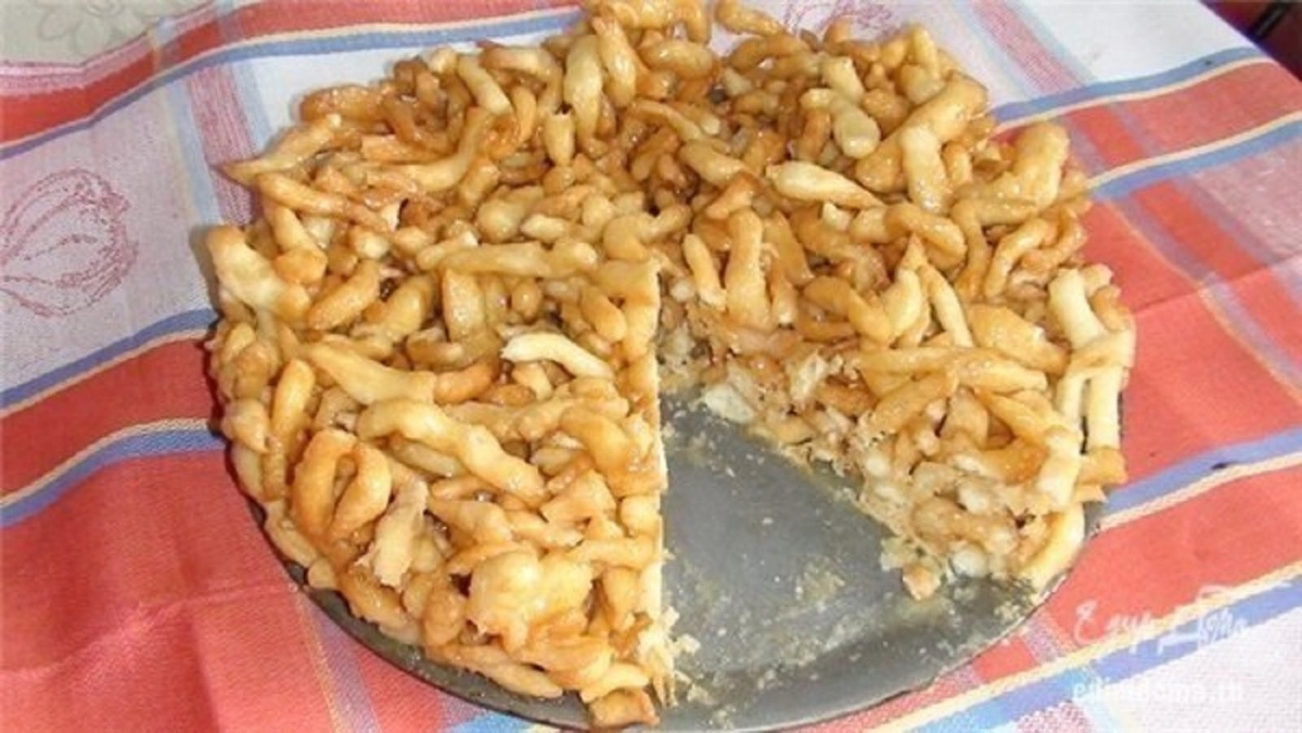Для приготовления по этому рецепту чак-чака, нужно взять следующие ингредиенты: - пять яиц, - пятьсот грамм муки, - четыре ложки столовых молока, - два кусочка сахара-рафинада, - одну ложку столовую масла сливочного, - одну ложку столовую водки, - соль, - пятьсот грамм меда, - по половине стакана сахара, - мака, - орехов и для фритюра - килограмм масла сливочного. В начале приготовления следует растереть желтки с сахаром и маслом. Затем посолить данную смесь и добавить к ней отдельно взбитые белки, основательно перемешать все и замесить на данной массе крутое тесто. Далее всыпав половину муки, необходимо ввести водку в полужидкое тесто, а если тесто все-таки будет недостаточно крутым, то стоит добавить еще муки. Затем образованное тесто завернуть в слегка влажную салфетку и дать ему полежать приблизительно пятнадцать минут. По истечению данного времени тесто раскатать в пласт, толщина которого должна быть три миллиметра, и нарезать длинными полосками, напоминающими лапшу, ши