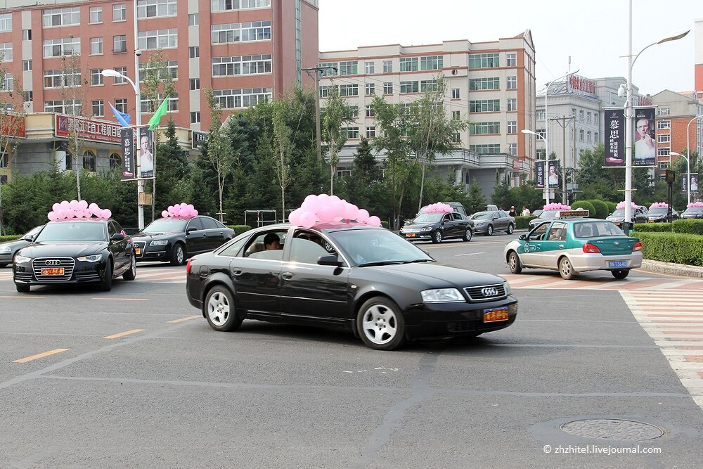 Мы привыкли, что у нас на свадьбах много разных машин, украшенных разноцветными шарами. В Китае предпочитают черные машины, причем автомобили, везущую одну свадьбу украшаются шарами одного цвета. Мы видели с розовыми шарами и с красными.