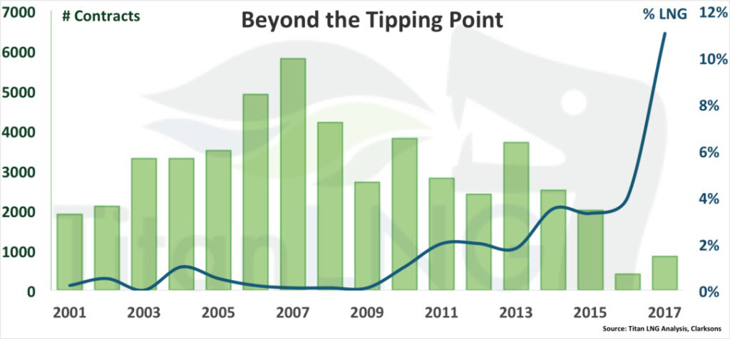Голландская компания Titan LNG заявила, что согласно её исследованиям, в 2017 году количество новых заказов в мире на строительство судов с приводом, работающим на СПГ, достигло 11% от общего числа заказов, полученных верфями. Годом раньше этот показатель находился на уровне менее 2%, в 2015 году -4 %. Об этом 2 января пишет Splash.