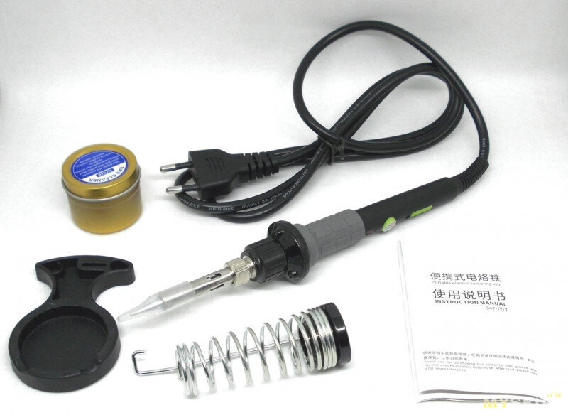 Продавцы на Aliexpress предлагают довольно много различных моделей паяльников с регулируемой температурой нагрева. При в общем сходной конструкции они тем не менее все таки отличаются качеством, комплектацией и определенными нюансами реализации. Данный паяльник дополнительно снабжен светодиодной подсветкой жала и имеет бонусы в комплектации. Что же касается качества реализации, то более подробно я об этом расскажу в самом обзоре. Характеристики паяльника, заявленные продавцом: Паяльник пришел вот в такой коробке из желтого картона. В комплекте также был EU-переходник, как оказалось – в качестве бонуса, так как вилка самого паяльника была также европейская. В комплекте помимо самого паяльника и инструкции была также подставка с держателем и стружка из медного сплава для очистки жала в баночке. Все это также оказалось приятным бонусом, потому что в описании товара указано не было. Непосредственно сам паяльник в сборе с жалом имеет длину около 20 см. Регулятор температуры – круговой. Диа