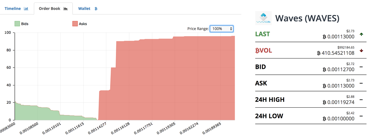 @craftcrypto - Крафтовое Крипто. Твой главный способ заработать на кокаин и шлюх. January 03, 2018 Нашел тут статейку на Реддите - «Что такое стены на продажу и зачем они нужны?». Решил перевести - возможно кому-то будет интересно. Заранее предупреждаю: моё мнение может не совпадать с мнением автора сего опуса, в частности, - я не считаю, что стены на продажу - это прямо-таки всегда манипуляция такого рода. Также добавил некоторые поправки от себя. Короче, Стена на продажу - это инструмент, который используется богачом или группкой богачей для влияния на цену криптовалюты (снижения этой цены). Ну, «богач» - это конечно же условная дебильность, на деле - это просто обладатель/обладатели достаточного для манипулирования количества Биткойнов. Большая цена на продажу на определенной отметке предотвращает исполнение ордеров по более высокой цене. Выглядит этот зверек вот так: Как это работает? Посмотрим на примере: Есть такой богатенький чувачок по имени, ну скажем, Джога. У Джоги есть еще