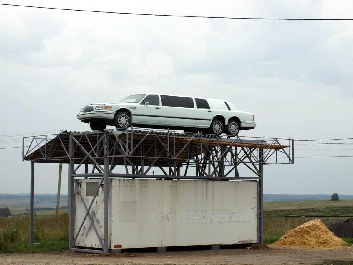 Лимузин на базе Lincoln Town Car был установлен на крыше кафе в деревне Быковка, Тульской области на обочине дороги Р140 (Тула-Новомосковск). Дата съёмки - 19 августа 2016 года. Эта конструкция появилась летом 2016 года у остановки на развилке дороги Тула-Новомосковск (Р140) и Тула-Киреевск. Сложная система из арматуры и уголков, с элементами поддержки кузова, исключает случайное происхождение автомобиля на этом месте. У оригинального лимузина Town Car две оси. Третья явно выглядит добавленной. Второе поколение Lincoln Town Car. Выпускалась с 1990 по 1997 год. Двигатель V-образная восьмёрка. В зависимости от года выпуска или пятилитровая или 4,6 литра. От 150 до 210 лошадей. Явно видно место над второй осью, куда врезана вставка. На багажнике шильдики модели. В бампере "американский" вырез под номер. Оба моста с дифференциалами, но у среднего нет "выхода" кардана к третьему мосту. Похоже что передняя и задняя часть от разных Линкольнов. Двигателя нет. Летящий лимузин, над Киреевскими