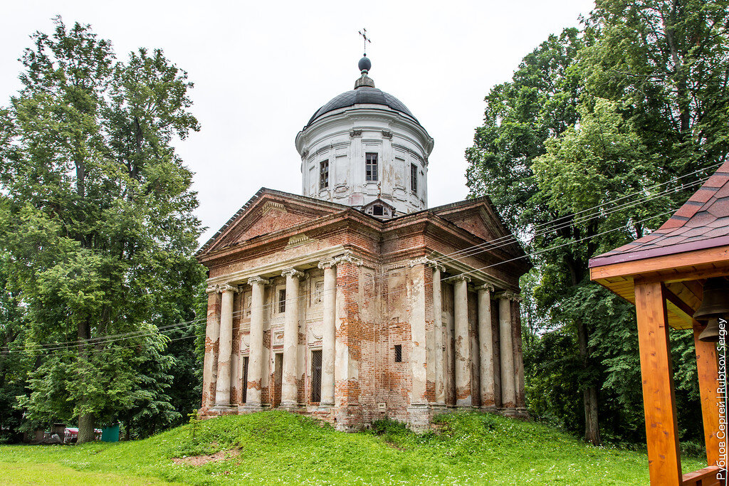 Село Алексино расположилось примерно в 17 км от города Дорогобуж Смоленской области на запруде реки Ведрошь . В данному селе в конца 18-го века располагалось имение дворянского рода Барышниковых. До наших дней сохранилось несколько интересных построек в стиле зрелого классицизма, но начнем мы знакомство у усадьбой сразу с двух местных храмов. Первый, проект которого приписывают знаменитому московскому архитектору Матвею Казакову, считается первой культовая постройка в стиле классицизма в Смоленской области – это храм Михаила Архангела: Каменный однопрестольный неотапливаемый храм был построен в период с 1778 по 1794 году по заказу хозяина усадьбы, строительством руководил крепостной архитектор Жданов. Здание церкви, по некоторым источникам, украшают барельефы одного из наиболее значимых скульпторов того времени - Федота Шубина. К сожалению, они в очень плачевном состоянии: Сейчас храм передали церкви и в планах работы по его восстановлению, но пока что он внутри храм больше похож на