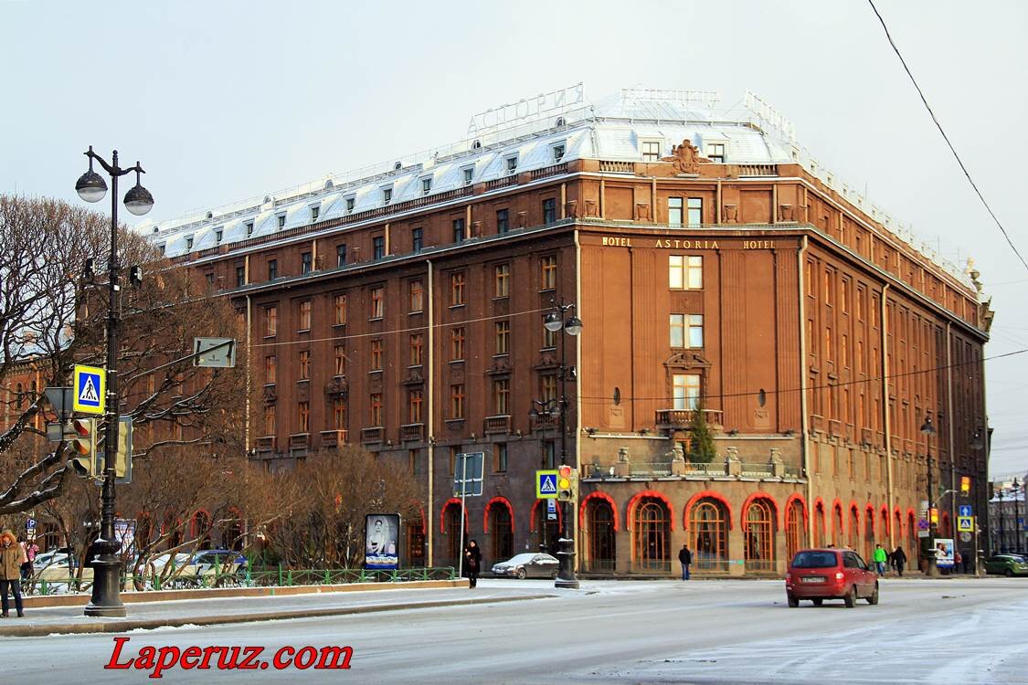 В конце XVIII столетия на этом месте находился угловой трёхэтажный дом, которым владела семья Погенполь. После он сменил нескольких хозяев, а в начале 1830-х годов на втором этаже был устроен зверинец, где демонстрировали редких змей и крокодилов. В 1830-х годах домом стала владеть почётная гражданка, купчиха Пелагея Калгина. Здесь жила семья академика живописи Николая Майкова, державшая литературный салон, который посещали Фёдор Достоевский, Иван Гончаров и другие писатели. Затем здание сменило ещё нескольких хозяев, пока в 1903 году его не купило страховое общество «Россия». Фёдор Лидваль подготовил проект гостиницы для акционерного общества «Палас-отель». Строительные работы проводились в 1911-1912 годах, причём угол на верхних этажах был срезан по требованию Академии художеств для сохранения вида на Исаакиевский собор с Большой Морской улицы. Первый и второй этаж гостиницы облицованы серовато-розовым гранитом, добытым на Каменногорском месторождении. В украшении интерьеров были ис