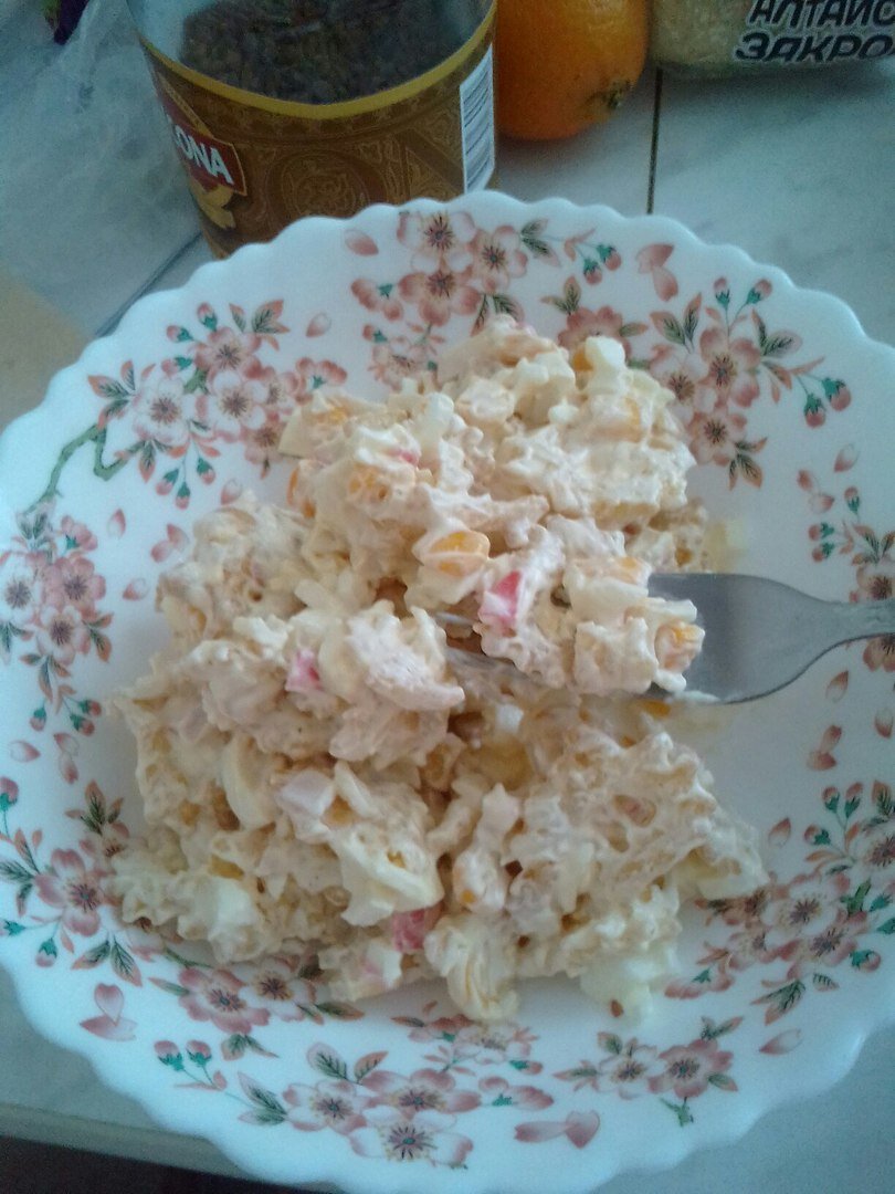 Ингредиенты: 1. Банка кукурузы 2. Крабовые палочки3. Майонез 4. 3 яичка5. Недорогие чипсыНу что? Приступим!1. Режем на мелкие кусочки крабовые палочки2. Закидываем кукурузы3. Теперь нужно положить чипсы