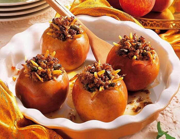 Верный способ удивить И снова мы вам предлагаем выйти за рамки привычного - вместо голубцов или пельменей попробуйте в этом году мясом нафаршировать яблоки. Закуска получается нарядной и к тому же весьма бюджетной. На 4 — 5 порций; 100 ккал/100 г. Надо: 4 — 5 средних яблок · 200 г любого мясного фарша · соль · черный молотый перец · свежая зелень по вкусу · 2 стакана бульона. Для соуса: 1 стакан сметаны · 2 — 3 зубчика чеснока · полпучка свежего укропа. Готовим: 1 Сначала мелко нарезаем зелень, добавляем ее в фарш, солим, перчим и хорошенько перемешиваем. 2 Из яблок ножом удаляем часть сердцевины — ровно столько, чтобы внутри осталось довольно много места для начинки. 3 Фаршем начиняем яблоки и аккуратно составляем их в сотейник с толстым дном. Заливаем бульоном и на медленном огне готовим под крышкой около 40 — 50 минут. После этого перекладываем яблоки в глубокое нарядное блюдо. А на дно непременно наливаем подливу. 4 Готовим соус: чеснок и укроп рубим ножом как можно мельче. Смешива