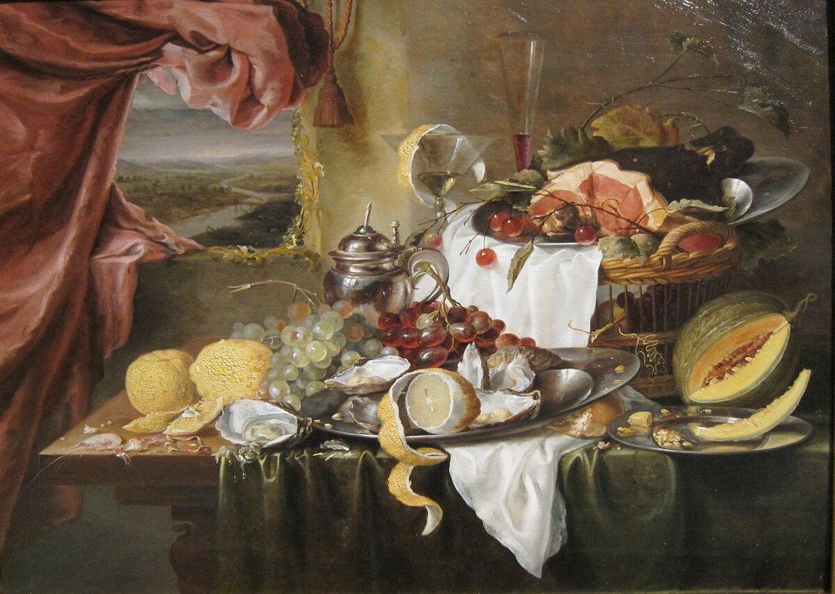Похоже, что для богатого. Еда здесь непростая: огромный копчёный окорок, фрукты (виноград, дыня), устрицы и лимон. Лимон в Голландии считался экзотическим фруктом; везти их приходилось из-за моря. Лимоны обычно сами по себе не ели, но делали из них лимонад: просто очищали лимон, резали его на мелкие кусочки, бросали в бокал с водой и размешивали специальной ложечкой. Именно поэтому на голландских картинах лимон обычно изображают наполовину очищенным, а шкурка его красивой спиралью спускается со стола.