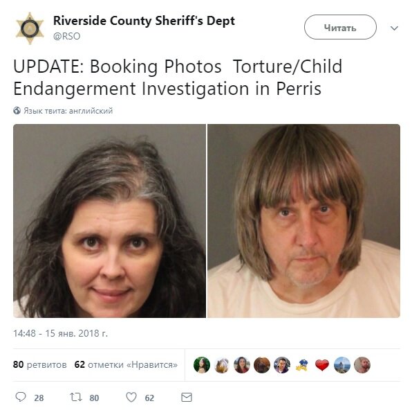 В американском городе Перрис, Калифорния, семейная пара удерживала в доме своих детей и привязывала их цепями к кроватям. Об этом сообщает местная полиция. Одной из девочек удалось сбежать. Утром 14 января она позвонила в полицию и сообщила, что родители насильно удерживают ее братьев и сестер в доме. Полиция обнаружила в доме 12 человек, привязанных к кроватям. Их содержали в темноте и антисанитарных условиях. Возраст пострадавших варьируется от двух до 29 лет. Из них семеро оказались совершеннолетними. Все они были госпитализированы для медицинского обследования и дальнейшего лечения. Родители пострадавших — 57-летний Дэвид Аллен Турпин и 49-летняя Луиза Анна Турпин — не смогли объяснить, почему держали детей на цепи. Полиция их задержала. CNN пишет со ссылкой на записи суда, что Дэвид Турпин был инженером, а его жена — домохозяйкой. Мать подозреваемого заявила, что это очень уважаемая семья. По ее словам, они очень хотели «защитить своих детей». Больше новостей на http://yasto