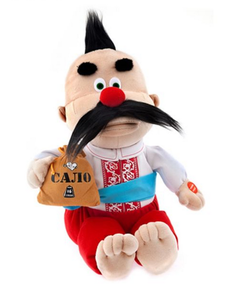 И вот попадаю в группу, а затем на сайт тобольского магазина цветов и подарков. Во вкладке "Игрушки" вижу нашего главного героя - дядьку Охрима. Дядька Охрим - это явно украинская тема, о чем свидетельствует внешний вид и надпись "сало" на мешочке в руках персонажа.