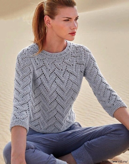 Ажурный женский пуловер с рукавом три четверти будет отличной вещичкой на каждый день. Очень лёгкий и уютный. Смотрится красиво. Вяжется очень просто и быстро. Размер: 36/38 Вам потребуется: 300 г. пряжи типа "Cumulus" от JUNIPER MOON светло-серого цвета (Fb 02) (94% хлопок, 6% нейлон, 230 м/100 г); короткие и длинные круговые спицы №6 и 6,5, а также крючок №5,5. Платочная вязка в круг. р.: попеременно 1 круг. р. - лиц. п., 1 круг. р. - изн. п. Ажурная дорожка в круговых рядах: Число петель кратно 3.