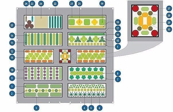 Каждый год я, как и многие садоводы, планирую посадки овощей на своем огороде. При этом многие садоводы задаются вопросом, как правильно посадить овощи, чтобы все культуры находились в выгодном для них соседстве. Приведу правильную схему овощной клумбы. На картинке указано расположение грядок и показаны цифры. Ниже вы найдете расшифровку по цифрам и поймете где нужно сажать каждый овощ. Схема посадки овощей на огороде: 1. Огурцы 2. Укроп 3. Свекла листовая 4. Лук-порей 5. Салат 6. Сельдерей 7. Капуста (разные сорта) 8. Горох 9. Красная свекла 10. Петрушка 11. Помидоры 12. Настурция, календула, бархатцы 13. Лук-севок 14. Морковь 15. Листовая капуста 16. Брюссельская капуста 17. Руккола 18. Фасоль спаржевая карликовая 19. Цуккини 20. Подсолнечники 21. Редис 22. Чеснок 23. Зеленый лук 24. Щавель 25. Ревень 26. Теплица-рассадник 27. Карликовые бархатцы 28. Травы: базилик, майоран, мята 29. Кудрявая петрушка 30. Вьющаяся фасоль