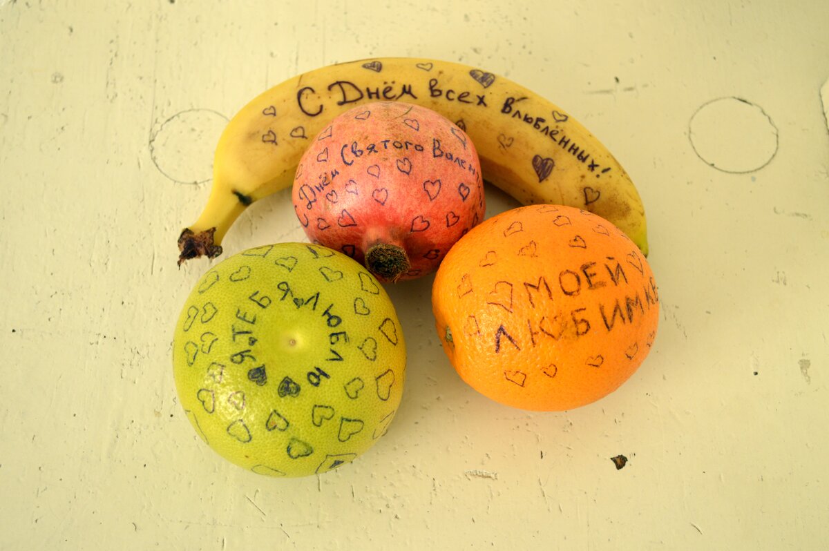 Съедобная валентинка своими руками за пару минут. Рассказываю, как сделать оригинальную съедобную валентинку, которая порадует любимого человека. Такая валентинка очень проста в исполнении, справиться даже ребёнок. Если ты бедный студент, или просто желаешь порадовать как можно больше близких людей, но не хочешь выглядеть банально то читай и запоминай. Берем любой фрукт, у которого перед тем как съесть, снимают кожуру: банан, апельсин, грейпфрут, гранат и т.п., и шариковой ручкой рисуем на нем сердечки и пишем признание в любви или пожелания. Всё. Ваша вкусная и стильная валентинка готова! Можно пойти дальше: купить съедобные маркеры и написать поздравления с Днем святого Валентина уже на любых фруктах: яблоках, грушах, хурме, разрисованные виноградинки также смотрятся круто. Такую стильную валентинку можно положить в ланч-бокс ребенку, собрать в пакет на работу мужу или преподнести любимой девушке.