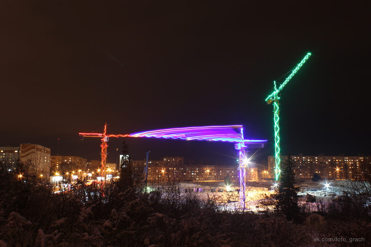 Наконец-то осуществил свою мечту и таки выбрался вечером запечатлеть светящиеся в ночи строительные краны.
