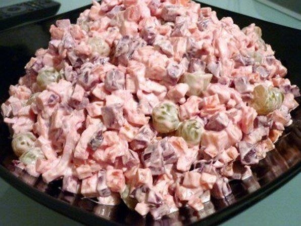 Ингредиенты: 4 крабовых палочки 1 отварное куриное филе 2 небольших варёных моркови 2 маленьких отварных свеклы гроздь винограда без косточек 150 грамм сыра майонез соль