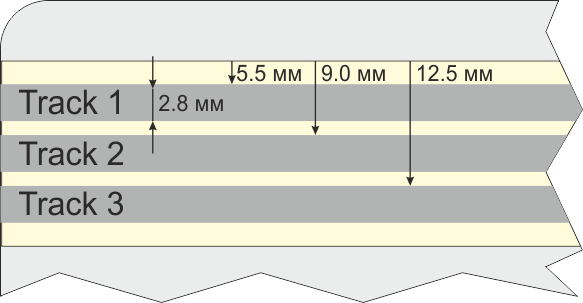 На магнитной полосе находится три дорожки, или три трека. Стандартизированы только первые два. Общих стандартов на третий трек нету (хотя отраслевые или частные стандарты существуют). Первые два трека предназначаются только для чтения (хотя технически переписать их можно). А третий предназначался и для чтения и для записи. Но в народ он не пошел. Как-нибудь расскажу о его нелегкой судьбе :)