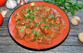 Я очень люблю готовить мясо, не банальное с луком, морковью, а что-нибудь более изысканное. С изюминкой, с пикантным вкусом и ароматом. А если есть время и необходимые продукты, почему бы не побаловать своих домочадцев оригинальным блюдом. Поэтому я вам настоятельно советую, попробовать именно этот рецепт мяса. Нам понадобится: 800 грамм свинины 8 помидоров 50 грамм грецких орехов 2 зуб.чеснока соль перец раст. масло зелень по вкусу Для маринада на 1 л воды: 6 горошин чёрного перца 1 лимон 2 луковицы 1 ч. л. сахара Сначала нужно приготовить маринад. Лук порезать крупными кольцами и положить его в воду. Туда же выдавить сок 1 лимона, добавить перец горошком и сахар. Мясо слегка отбить, нарезать не очень крупными кусочками и замариновать на 1 час. Тем временем помидоры нужно вымыть, обдать кипятком и снять кожицу. И натереть на мелкой тёрке, можно измельчить блендером. Грецкие орехи потолочь в ступке, или также воспользоваться блендером. Чеснок пропустить через пресс. К томатной массе д