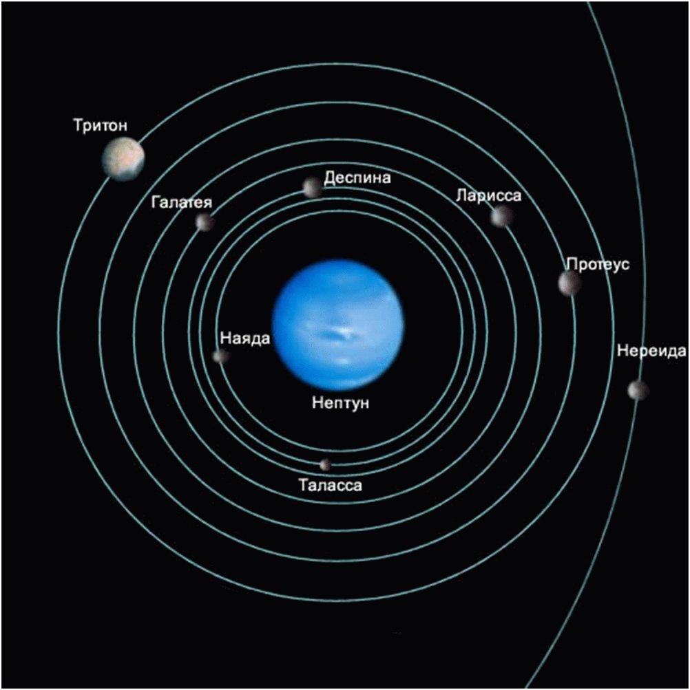 Нептун по размеру чуть меньше Урана. Он имеет 13 спутников, которым даны имена разных божеств — властителей морей, непосредственно подчиненных в римской мифологии Нептуну. Крупнейший из них — Тритон (единственный спутник Нептуна, имеющий шарообразную форму). Это самый холодный спутник в Солнечной системе. Температура здесь опускается до -240 °С. Однако даже несмотря на такой мороз, поверхность Тритона чрезвычайно активна — на спутнике постоянно происходят извержения вулканов.