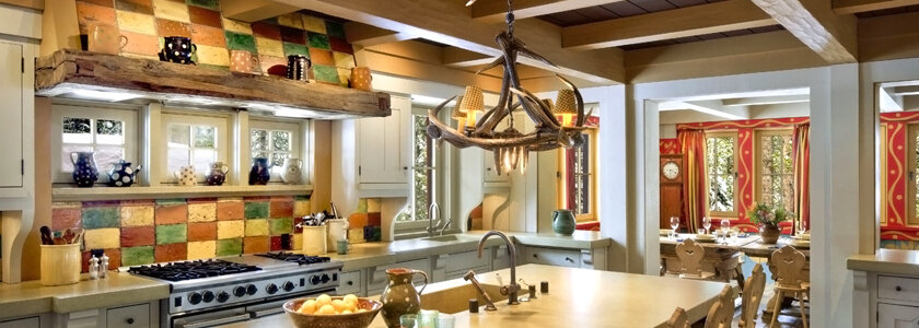 Нередко кухни в загородных домах имеют два выхода: на задний двор или террасу и собственно в дом. Проходная кухня многим нравится, потому что может быть светлым, функциональным и просторным помещением. При правильном подходе тот факт, что помещение проходное, может быть не недостатком, а преимуществом. Кухни в доме на земле, как правило, большие, а хорошее естественное освещение и продуманный дизайн проходной кухни создают впечатление простора и какой-то основательности.