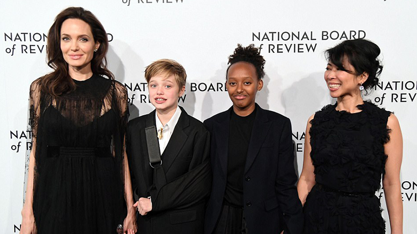 Еще в среду известная актриса и режиссер Анджелина Джоли блистала в Лос-Анджелесе на церемонии «Золотой глобус», а уже в четверг появилась в Нью-Йорке на National Board of Review Awards Gala. Да не одна, а в сопровождении двух дочерей, 11-летней Шайло и 13-летней Захарой. Также на красную дорожку вместе с семьей вышла Лун Ун – ассистент Джоли в работе над сценарием нашумевшего фильма «Сначала они убили моего отца». Продолжив тему образов на «Золотом глобусе», все четверо оделись в черное. 42-летняя красавица-мама выступала первой в длинном декольтированном платье черного цвета от Valentino. Поверх платья звезда набросила кружевную накидку, украшенную блестками и перьями. Готический стиль прекрасно сочетается с вневременной красотой актрисы и ее королевской осанкой. В этот вечер Анджелина отказалась от черных стрелок и алых губ, выбрав макияж в нейтральных тонах. Волосы она оставила распущенными, уложив их крупными волнами. А из украшений выбрала только скромные серьги и кольцо. Дети