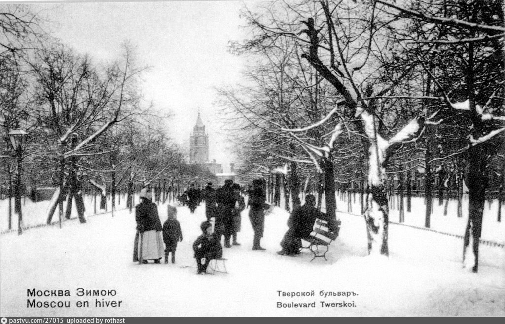 Самый протяженный и самый первый бульвар в составе бульварного кольца. Название Тверской закрепилось по одноименной улице в конце 18 в. Ранее именовался просто Бульвар, поскольку в городе был единственным в своем роде. Именно поэтому на нем высаживали все деревья подряд, смотря какие лучше приживутся в московском климате. Начали с берез, потом липы, клены, вязы, дубы, ели, туи. В николаевскую эпоху были посажены шелковичные деревья, поздно дающие листву. Известен казус, что как-то Николай 1, гуляя по бульвару, обратил внимание на палки, торчащие вместо деревьев. Шелковичные деревья, в лучших традициях московских градоначальников, заменили на следующий день. Тверской бульвар изначально был модным местом прогулок и встреч московского дворянства. Это обуславливало и застройку особняками по периметру. В часы променада, все вокруг было заставлено экипажами – свободных парковочных мест не было. Бульвар изрядно пострадал в Отечественную войну 1812 г. мало того, что все выгорело во