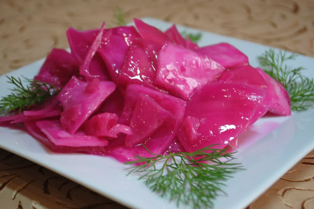 Капуста, приготовленная по нашему рецепту, готова к употреблению уже через 48 часов. Получается она хрустящей, красивой, аппетитной, в меру острой. Но имеет один недостаток-очень быстро заканчивается!
