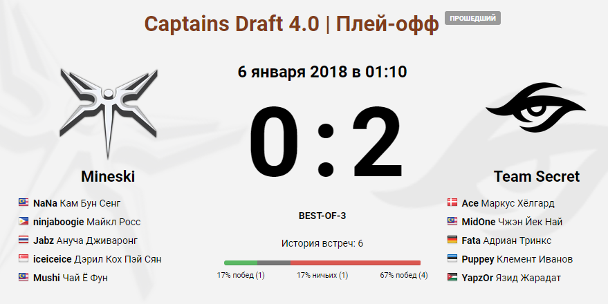 На первой карте саппорты обеих команд активно перемещаются по карте, но первые ротации оказываются неудачными. Только к десятой минуте Mineski удается заработать минимальное преимущество. После нескольких разменов Team Secret забирает первого Рошана, после чего перехватывает инициативу, выигрывает тимфайт за тимфайтом, доводя преимущество до 10 тыс. золота. В драке за второго Рошана европейский коллектив не оставляет сопернику шансов, разменивая одного героя на пять. Mineski не имеет выкупов, теряет первую сторону и Аегис. Secret перегруппировывается и уверенно заканчивает игру на 38 минуте. Во второй игре Team Secret рано проливает первую кровь и закрепляет экономическое преимущество. Несмотря на это mushi проводит несколько удачных ротаций и перефармливает соперника, выходя на первую строчку таблицы нетворсов. На 21 минуте Mineski пытается забрать Рошана, и забирает Аегис, но вынуждена потратить выкуп Jakiro и увеличивает общее экономическое отставание. Европейский коллектив