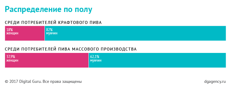 Если по возрасту потребители массового и крафтового пива в сети практически совпадают, то у крафтового пива куда выше активность среди авторов мужского пола (82% всех пользователей) и пользователей из Санкт-Петербурга (их в два раза больше, чем потребителей не крафтового).