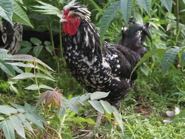 - Окрас оперения не равномерный – с хаотичным рисунком. Основные цвета, которые присутствуют на перышках – черный и белый. У петушков некоторые перышки отдают зеленоватым отливом. В целом выглядят представители обеих полов рябыми.