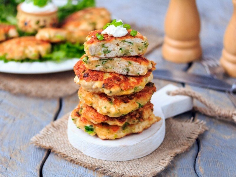 Любимым вторым блюдом легко станут оладьи из куриной грудки с сыром и зеленью. Готовятся они быстрее и проще, чем котлеты, выглядят нарядно. Вот что понадобится: • 1 сырая куриная грудка (2 филе); • 2 сырых куриных яйца; • средняя репчатая луковица; • 50-60 граммов твердого сыра; • половина пучка зелени; • немного пшеничной муки; • соль, перец по вкусу. Зелень подойдет практически любая: зеленый лук, укроп, петрушка, сельдерей, кинза, базилик, чабрец – на выбор или все вместе. Также по желанию можно добавить чеснок.