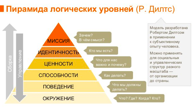Признайтесь, Вы иногда задаётесь вопросом «Почему я живу так, как живу?» или «Почему я имею то, что имею?» Если да — сегодня я хочу поделиться с Вами ответом на этот вопрос и рассказать Вам о пирамиде Дилтса. По меньшей мере, о том, как я её понимаю и как использую для себя и своих клиентов. Роберт Дилтс один из наиболее известных экспертов-разработчиков в нейро-лингвистическом программировании (лично я нежно люблю его за разработки для писателей и журналистов), предложил удобную для описания Вашей жизни модель в виде пирамиды. Особенность модели в том, что для каждого из уровней пирамиды ответ на вопрос «Почему это так?» лежит на один уровень выше. Нижний уровень пирамиды, уровень Вашего быта, Вашей повседневности, отвечает на вопрос «Что я имею?» Это касается и Ваших финансов, и Вашей работы или бизнеса, и Вашего дома, Вашей семьи, Вашего круга общения и т.п. Если же Вы зададитесь вопросом «Почему я имею то, что имею?», за ответом придётся обратиться на второй уровень, где находятс