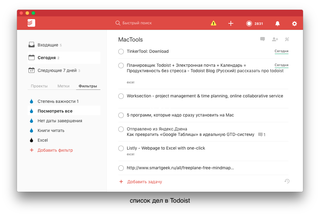 Я остановился на несправедливо забытом 2Do. Он избавился от сквеморфизма и смотрелся современно. Но уровень вхождения был выше остальных: нагруженность интерфейса отпугивала. За пару дней я к нему привык. Забрасывал в него всё, что находил в интернете. В итоге накопился хлам, который тяжело было разобрать. Из-за того, что мне сложно было навести порядок, я забросил его.