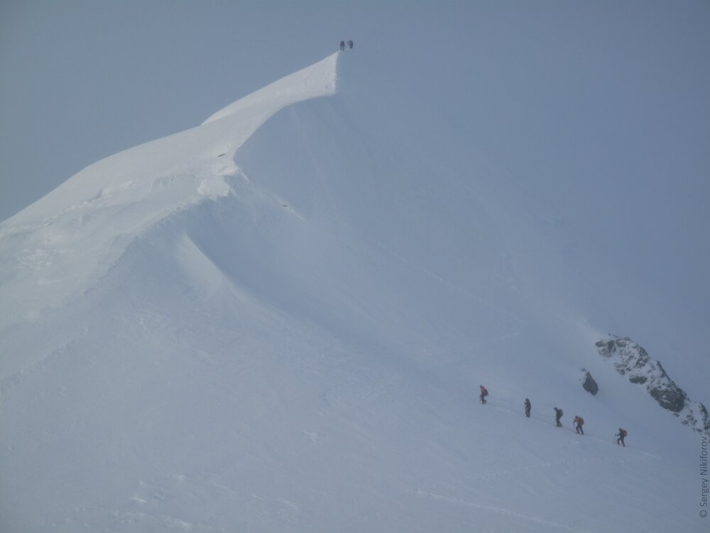 Восхождения — это не всегда яркие и красочные фотографии, иногда все проходит в черно-белой мгле густой облачности. Второй раз на вершину Монблана — высочайшую точку Альп, я поднялся в начале июня 2011 года вдвоем со своей женой со стороны Aiguille du Goûter. На восхождение стартовали в сильный ветер с поземкой, периодически тучи срывало и видимость улучшалась, и мы надеялись на солнце, но на вершине после обильного снегопада мы стояли в непроницаемом облаке и не видели абсолютно ничего далее 15 метров.