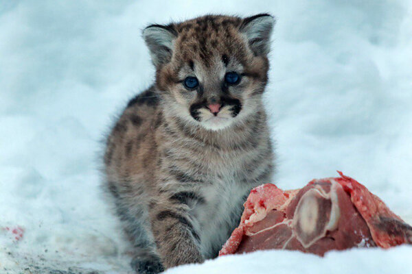 Фотографии одного из малышей четы пум, впервые вышедшего из своего укрытия, сотрудники Новосибирского зоопарка опубликовали в соцсетях. Голубоглазые котята пум появились на свет в конце ноября, Но ставшая мамой самка Милана, проживающая в Новосибирском зоопарка, своим малюток долго скрывала. Пока даже сотрудники зоопарка не знают, сколько котят родилось у 10-летней Миланы и 14-летнего Гудзона. Обычно их у пум рождается от одного до пяти. «Как все кошки, первые недели скрывала малышей, редко выходила из укрытия, — сказала заведующая отделом хищных животных Роза Соловьева. — Наши пумы круглогодично живут на улице, у них хорошо утепленный домик, куда так просто не заглянешь. Мы не стали их тревожить, и потому точно еще не знаем, сколько у Миланы детенышей. Пока мы видели одного. Он вышел из домика, огляделся и попробовал мясо. Очень симпатичный, голубоглазый и пятнистый. У нас не было маленьких пум уже пять лет. Мы соскучились по ним». В Новосибирском зоопарке пумы содержатся с 1967 год
