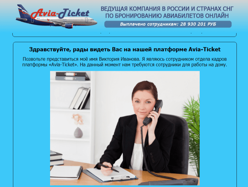 Платформа Avia-Ticket – крупнейшая международная платформа по бронированию А/В билетов объявила о наличии вакансий. На постоянной основе набираются сотрудники для выполнения несложной работы через интернет. Ежедневные выплаты могут превысить 30000 рублей в день. Вложения, опыт и профессиональные навыки не требуются. Проект представляет сотрудник отдела кадров Виктория Иванова. По ее словам, работать придется дистанционно (на дому). Для работы подойдет любое устройство с выходом в интернет. Мы решили попробовать заработать обещанную сумму, впечатлениями делимся со своими читателями.