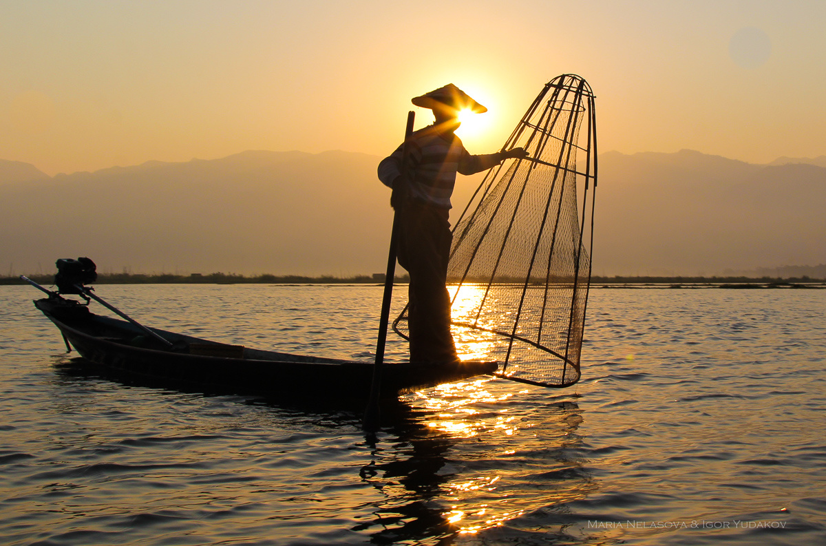 Люди тут живут прямо на воде и называют себя "инта", что значит "сыновья озера". А название озера- Инле с бирманского переводится как "маленькое озеро". Его размеры 20×7 км, глубина до 5м, расположено на высоте 900 м над уровнем моря. Рыбаки практикуют очень колоритный метод рыбалки: стоя на одной ноге на краю лодки, второй ногой виртуозно подгребают веслом, замысловато его обвив ногой. Руки при этом свободны и они ловко орудуют сетями или специальной плетеной ловушкой, которой они накрывают рыбу и затем накалывают трезубцем через отверстие вверху. Изображение рыбака, рыбачащего таким методом, прославило их на весь мир и стало символом озера Инле. Но, не все рыбаки зарабатывают рыбалкой, в самом начале путешествия по озеру, стоят несколько лодок, где предприимчивые жители имитируют интересный метод рыбалки и за определенную плату могут одеть корзину хоть на голову, позируя для фотографов :) Но отъехав подальше, можно увидеть много настоящих тружеников озера, которые действительно с п