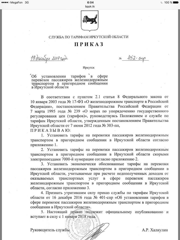 15 декабря глава правительства России Дмитрий Медведев, встретившись с членами Совета при Правительстве по вопросам попечительства в социальной сфере, строго предостерег против неоправданного повышения тарифов на услуги. По всей признакам, у руководства "Байкальской пригородной пассажирской компании" и у правительства Иркутской области в целом либо со слухом плохо, либо жажда наживы заставляет забыть об осторожности. 19 декабря 2017 года руководитель региональной Службы по тарифам Александр Халиулин подписал приказ о повышении тарифов на перевозку. В среднем тарифы увеличены, по словам источника Бабра в БППК, на 30%. В приказе указывается на "экономическое обоснование тарифа". О чем идет речь и почему рост тарифов на перевозку самых социально незащищенных слоев населения вдруг почти втрое превысил инфляцию - непонятно. Напомним, что БППК регулярно вытягивает из бюджета Иркутской области колоссальные средства за "недополучение доходов за пассажирские перевозки в электричках". При этом
