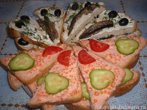 1. Хлеб разрезать по диагонали, намазать икрой и майонезом.