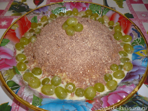 6. Блинную горку посыпать тёртым шоколадом. Сверху украсить виноградом.