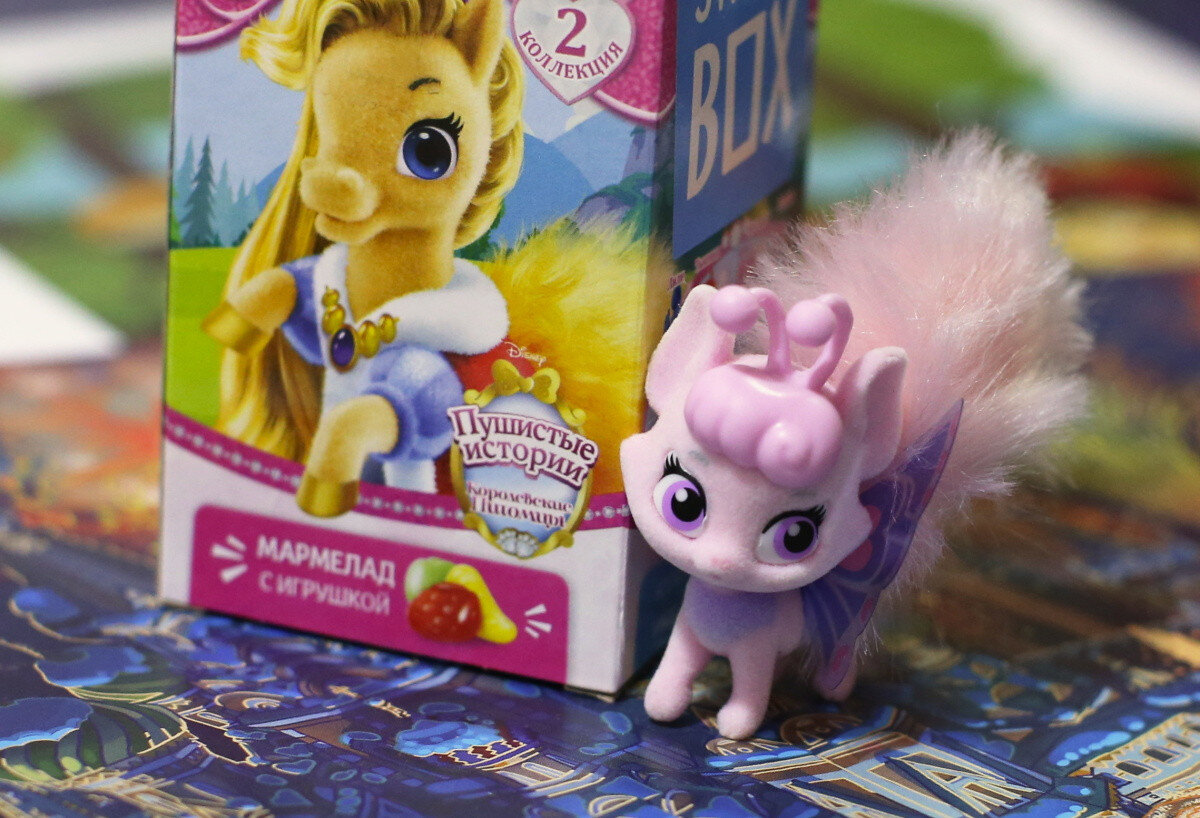 Карнавальная коллекция Sweetbox представляет вторую коллекцию фигурок Disney «Королевские Питомцы», мармелад с игрушкой! Любимые питомцы знаменитых на весь мир очаровательных Принцесс Disney представлены во всей красе, во второй серии в весьма необычном виде. Это карнавальная коллекция, поэтому и образы у питомцев очень необычные. В коллекции 8 зверюшек: Милашка, Лили, Жемчужинка, Тыковка, Крошка, Султан, Ягодка и Звёздочка. Хвостики у них яркие и пушистые, как настоящие (кроме Султана: ему, как тигру, пушистого хвоста не полагается). В каждой коробочке Sweetbox находится фруктовый мармелад, вкладыш с историей персонажа и изображением всех фигурок серии на другой стороне и коллекционная игрушка с флоковым покрытием – мягкая, как бархатная, приятная на ощупь. Собери всю коллекцию и узнай, как питомцы нашли своих добрых, очаровательных хозяек, милых принцесс Дисней! Нам в коробочке досталась фигурка котёнка Милашки, питомицы Авроры. Вот она и её буклет: У этой фигурки прозр